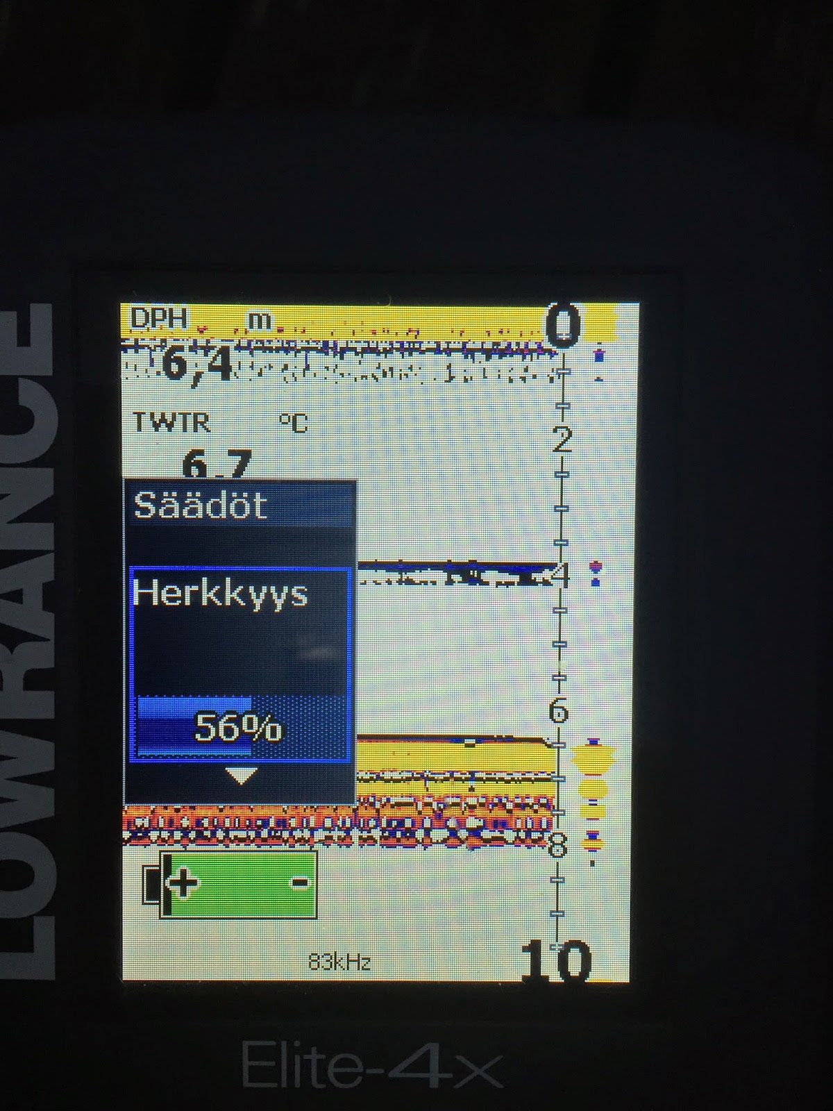 Herkkyyttä täytyy säädellä monista eri syistä ja yksi niistä on syvyys: mitä matalampaa on, sitä pienemmäksi herkkyys säädetään. Herkkyyden asteikko on nollasta sataan prosenttia ja parin kolmen metrin syvyydessä käytän herkkyyttä 50-60. Tuota minun kaikua ei oikeastaan alle kahden metrin vedessä enää pysty käyttämään, koska näyttöön tulee niin paljon häiriöitä, vaikka herkkyyttä yrittäisi pienentää alle viitenkymmeneenkin. Sitten jos pienentää herkkyyttä liikaa, pohja alkaa hävitä ja kaiku näyttää vaan yli kaksikiloiset ahvenet ja se kilon ahven saattaa tulla puskista :)