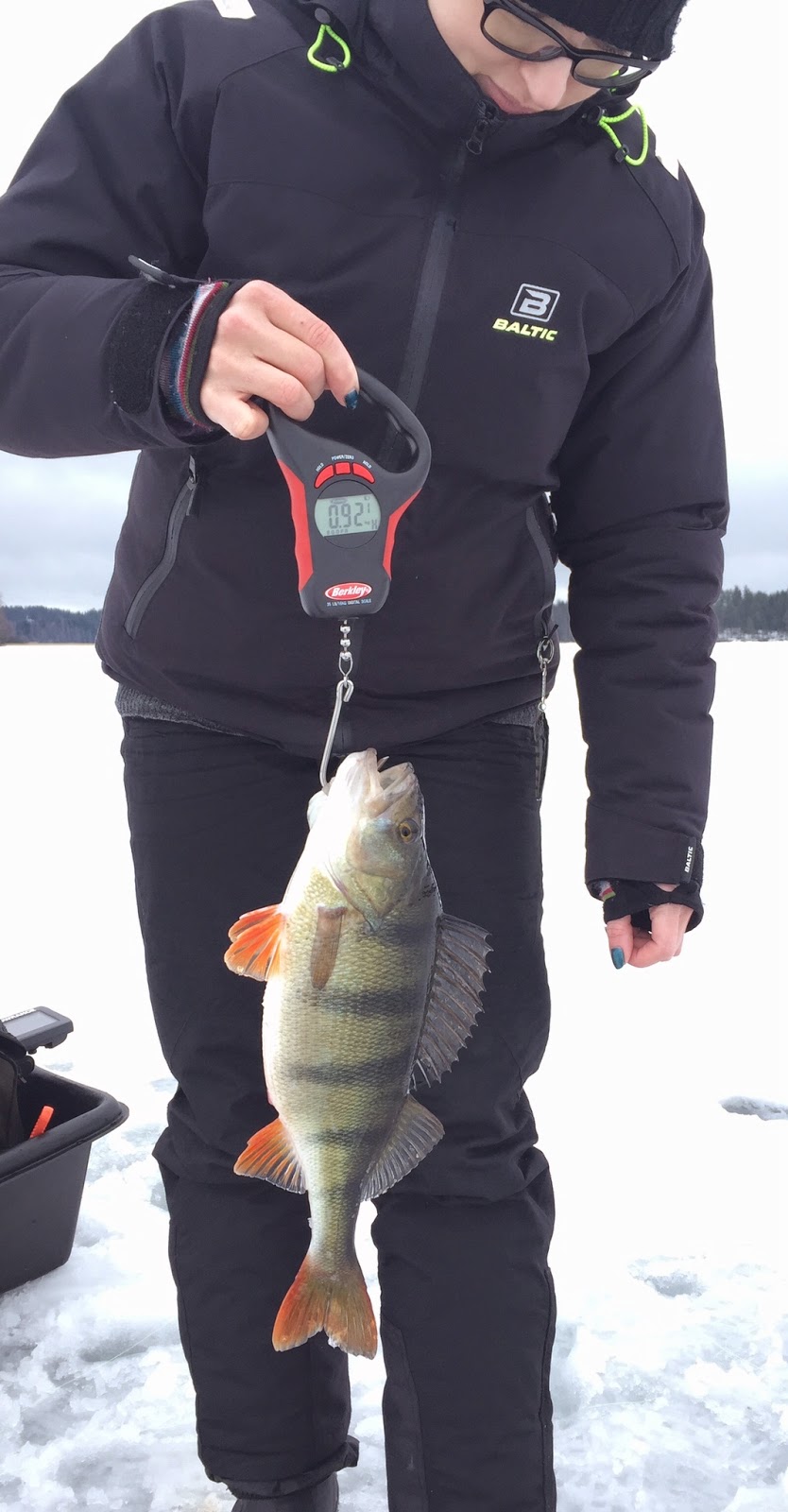 Ai niin, karkuutin jonkun hirmuisen valaan. Vettä oli 10 metriä ja viidestä metristä ”ihan puskista” sain tosi kovan tärpin, kala pysyi ehkä metrin matkan siimassa ja sitten irtosi. Tuntui, kuin jigin koukku olisi ollut jossain betonimöhkäleessä kiinni, ei meinannut siima hievahtaa mihinkään. Nanosiima kerkesi jo vähän uppoutua sormiin ja jos sitä valtavaa otusta olisi yhtään enemmän pitänyt vielä nostaa, todennäköisesti sormenpäät olisivat tippuneet yksitellen jäälle. Se oli ISO kala, en tiedä haluaisinko sitä edes toista kertaa oman siiman päähän.. koska se on sitten hei hei sormet.